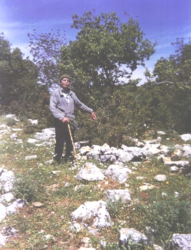 اسعد خليل سمعان ( ابو جمال ) يشير الى احد القبور في المقبرة المسيحية