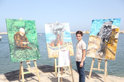 الطفل الفلسطيني محمد بكر يجسّد معاناة صيادي قطاع غزة، بلوحات تبلغ من النضج الفني ما يتجاوز سنوات عمره الـ13، على الرغم من الحصار والتضييق الإسرائيليين.