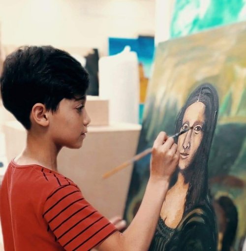 ربما يذهلك محمد، ابن الـ13 عاماً، وهو منهمكٌ أمام لوحة تفوقه طولاً وعرضاً، محاولاً الاستناد إلى الكرسي ليرفعه، لتتساءل بينك وبين نفسك أهو حقاً من أنجز تلك اللوحات وحده؟ أم هناك يدٌ خفية تساعده؟