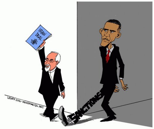 ظريف وأوباما: الاتفاق النووي وعقوبات العرقلة الأمريكية – كاريكاتير: كارلوس لطوف