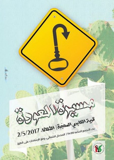 حيفا – مكاتب "الاتحاد" - تعلن جمعية الدفاع عن حقوق المهجرين عن تنظيم مسيرة العودة العشرين على أراضي قرية الكابري المهجرة، بتاريخ 2.5.2017 بدءً من الساعة الثانية بعد الظهر، وذلك بعد أن تم تذليل كل العقبات المتعلقة باختيار موقف السيارات ومكان تنظيم المسيرة، بحيث يكونان على جاهزية لاستقبال عشرات الآلاف من ابناء شعبنا.